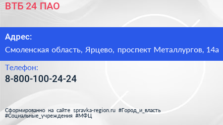 ВТБ 24, ПАО по адресу Смоленская область, Ярцево, проспект Металлургов, 14а в дальнейшем Организация, размещена в следующих категориях: