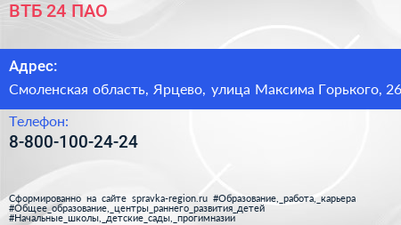 ВТБ 24, ПАО по адресу Смоленская область, Ярцево, улица Максима Горького, 26 в дальнейшем Организация, размещена в следующих категориях: