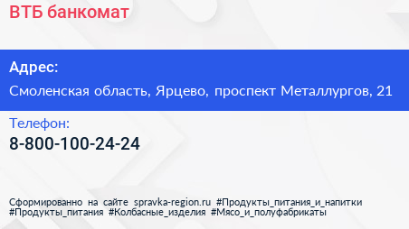 ВТБ, банкомат по адресу Смоленская область, Ярцево, проспект Металлургов, 21 в дальнейшем Организация, размещена в следующих категориях: