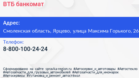 ВТБ, банкомат по адресу Смоленская область, Ярцево, улица Максима Горького, 26 в дальнейшем Организация, размещена в следующих категориях: