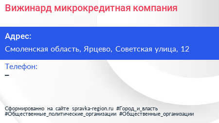 Вижинард, микрокредитная компания по адресу Смоленская область, Ярцево, Советская улица, 12 в дальнейшем Организация, размещена в следующих категориях: