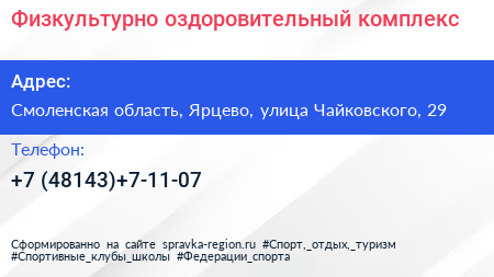 Физкультурно-оздоровительный комплекс по адресу Смоленская область, Ярцево, улица Чайковского, 29 в дальнейшем Организация, размещена в следующих категориях: