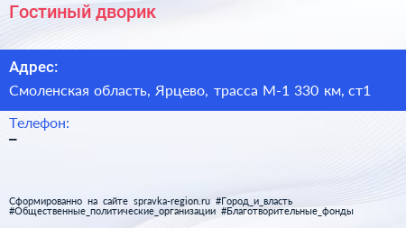 Гостиный дворик по адресу Смоленская область, Ярцево, трасса М-1 330 км, ст1 в дальнейшем Организация, размещена в следующих категориях: