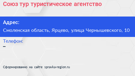 Союз-тур, туристическое агентство по адресу Смоленская область, Ярцево, улица Чернышевского, 10 в дальнейшем Организация, размещена в следующих категориях: