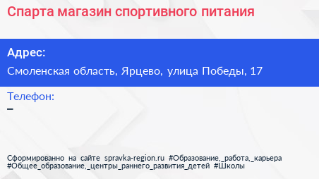 Спарта, магазин спортивного питания по адресу Смоленская область, Ярцево, улица Победы, 17 в дальнейшем Организация, размещена в следующих категориях: