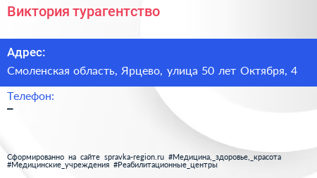 Виктория, турагентство по адресу Смоленская область, Ярцево, улица 50 лет Октября, 4 в дальнейшем Организация, размещена в следующих категориях: