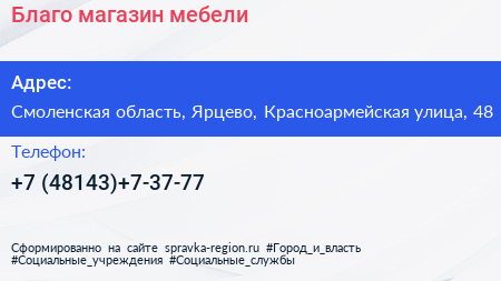 Благо, магазин мебели по адресу Смоленская область, Ярцево, Красноармейская улица, 48 в дальнейшем Организация, размещена в следующих категориях: