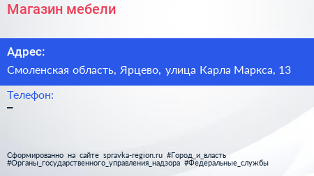 Магазин мебели по адресу Смоленская область, Ярцево, улица Карла Маркса, 13 в дальнейшем Организация, размещена в следующих категориях:
