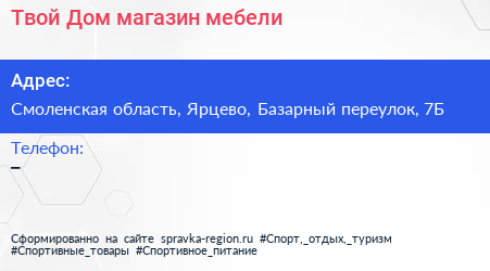 Твой Дом, магазин мебели по адресу Смоленская область, Ярцево, Базарный переулок, 7Б в дальнейшем Организация, размещена в следующих категориях: