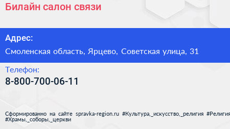 Билайн, салон связи по адресу Смоленская область, Ярцево, Советская улица, 31 в дальнейшем Организация, размещена в следующих категориях: