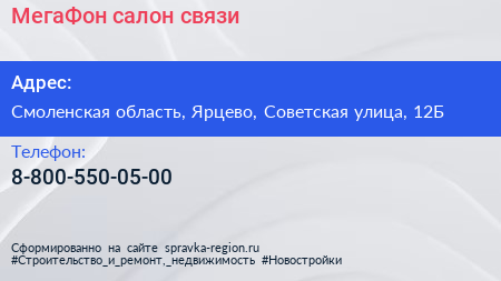 МегаФон, салон связи по адресу Смоленская область, Ярцево, Советская улица, 12Б в дальнейшем Организация, размещена в следующих категориях: