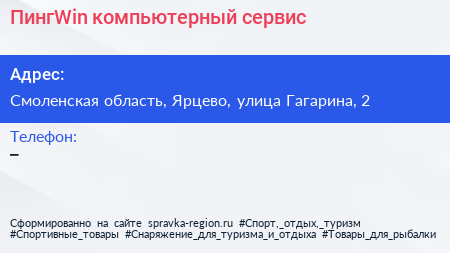ПингWin, компьютерный сервис по адресу Смоленская область, Ярцево, улица Гагарина, 2 в дальнейшем Организация, размещена в следующих категориях: