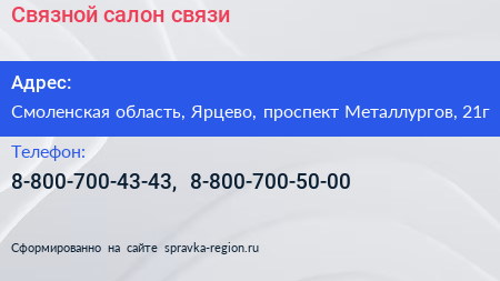 Связной, салон связи по адресу Смоленская область, Ярцево, проспект Металлургов, 21г в дальнейшем Организация, размещена в следующих категориях: