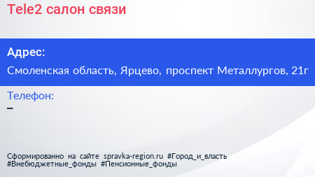 Tele2, салон связи по адресу Смоленская область, Ярцево, проспект Металлургов, 21г в дальнейшем Организация, размещена в следующих категориях: