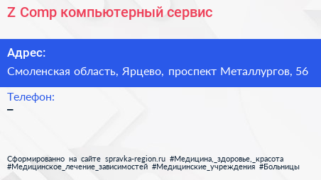 Z-Comp, компьютерный сервис по адресу Смоленская область, Ярцево, проспект Металлургов, 56 в дальнейшем Организация, размещена в следующих категориях: