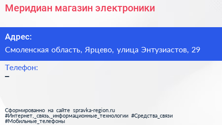 Меридиан, магазин электроники по адресу Смоленская область, Ярцево, улица Энтузиастов, 29 в дальнейшем Организация, размещена в следующих категориях: