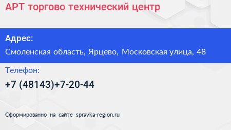 АРТ, торгово-технический центр по адресу Смоленская область, Ярцево, Московская улица, 48 в дальнейшем Организация, размещена в следующих категориях: