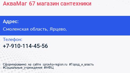АкваМаг. 67, магазин сантехники по адресу Смоленская область, Ярцево, в дальнейшем Организация, размещена в следующих категориях: