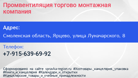 Промвентиляция, торгово-монтажная компания по адресу Смоленская область, Ярцево, улица Луначарского, 8 в дальнейшем Организация, размещена в следующих категориях: