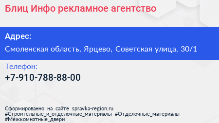 Блиц Инфо, рекламное агентство по адресу Смоленская область, Ярцево, Советская улица, 30/1 в дальнейшем Организация, размещена в следующих категориях: