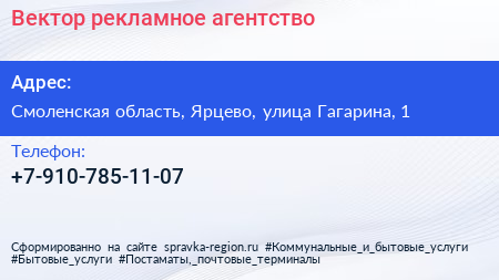 Вектор, рекламное агентство по адресу Смоленская область, Ярцево, улица Гагарина, 1 в дальнейшем Организация, размещена в следующих категориях: