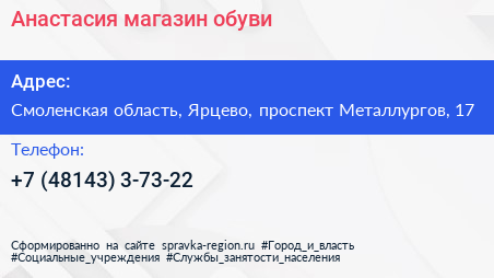 Анастасия, магазин обуви по адресу Смоленская область, Ярцево, проспект Металлургов, 17 в дальнейшем Организация, размещена в следующих категориях: