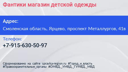 Фантики, магазин детской одежды по адресу Смоленская область, Ярцево, проспект Металлургов, 41в в дальнейшем Организация, размещена в следующих категориях: