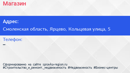 Магазин по адресу Смоленская область, Ярцево, Кольцевая улица, 5 в дальнейшем Организация, размещена в следующих категориях: