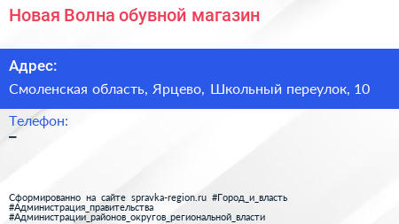 Новая Волна, обувной магазин по адресу Смоленская область, Ярцево, Школьный переулок, 10 в дальнейшем Организация, размещена в следующих категориях: