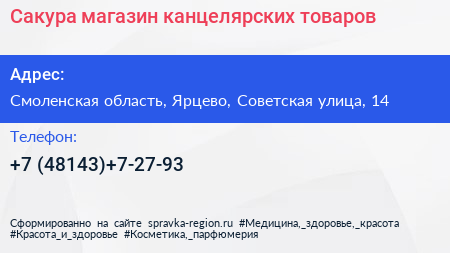 Сакура, магазин канцелярских товаров по адресу Смоленская область, Ярцево, Советская улица, 14 в дальнейшем Организация, размещена в следующих категориях: