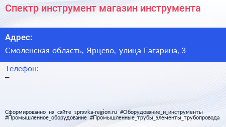 Спектр инструмент, магазин инструмента по адресу Смоленская область, Ярцево, улица Гагарина, 3 в дальнейшем Организация, размещена в следующих категориях: