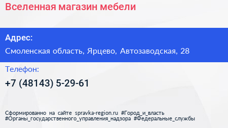 Вселенная, магазин мебели по адресу Смоленская область, Ярцево, Автозаводская, 28 в дальнейшем Организация, размещена в следующих категориях: