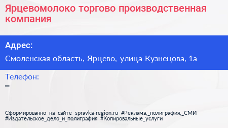 Ярцевомолоко, торгово-производственная компания по адресу Смоленская область, Ярцево, улица Кузнецова, 1а в дальнейшем Организация, размещена в следующих категориях: