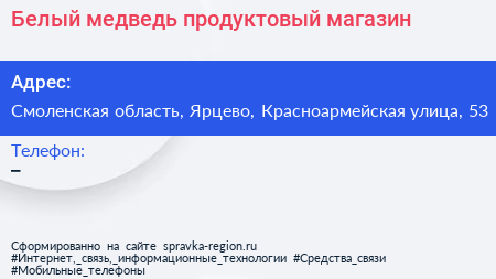 Белый медведь, продуктовый магазин по адресу Смоленская область, Ярцево, Красноармейская улица, 53 в дальнейшем Организация, размещена в следующих категориях: