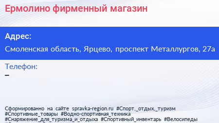 Ермолино, фирменный магазин по адресу Смоленская область, Ярцево, проспект Металлургов, 27а в дальнейшем Организация, размещена в следующих категориях: