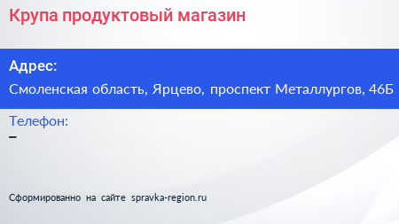 Крупа, продуктовый магазин по адресу Смоленская область, Ярцево, проспект Металлургов, 46Б в дальнейшем Организация, размещена в следующих категориях: