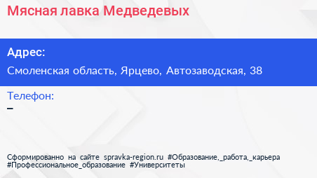Мясная лавка Медведевых по адресу Смоленская область, Ярцево, Автозаводская, 38 в дальнейшем Организация, размещена в следующих категориях: