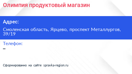 Олимпия, продуктовый магазин по адресу Смоленская область, Ярцево, проспект Металлургов, 39/19 в дальнейшем Организация, размещена в следующих категориях: