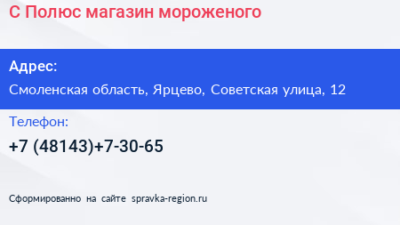 С-Полюс, магазин мороженого по адресу Смоленская область, Ярцево, Советская улица, 12 в дальнейшем Организация, размещена в следующих категориях: