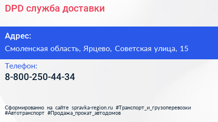 DPD, служба доставки по адресу Смоленская область, Ярцево, Советская улица, 15 в дальнейшем Организация, размещена в следующих категориях: