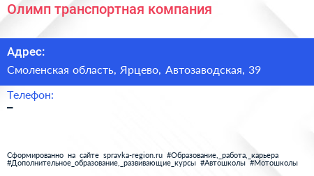 Олимп, транспортная компания по адресу Смоленская область, Ярцево, Автозаводская, 39 в дальнейшем Организация, размещена в следующих категориях: