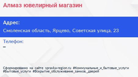 Алмаз, ювелирный магазин по адресу Смоленская область, Ярцево, Советская улица, 23 в дальнейшем Организация, размещена в следующих категориях: