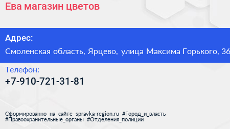 Ева, магазин цветов по адресу Смоленская область, Ярцево, улица Максима Горького, 36 в дальнейшем Организация, размещена в следующих категориях: