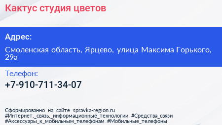 Кактус, студия цветов по адресу Смоленская область, Ярцево, улица Максима Горького, 29а в дальнейшем Организация, размещена в следующих категориях: