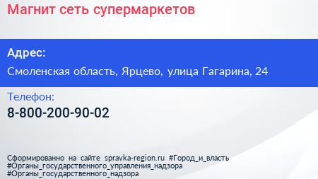 Магнит, сеть супермаркетов по адресу Смоленская область, Ярцево, улица Гагарина, 24 в дальнейшем Организация, размещена в следующих категориях: