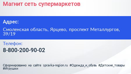 Магнит, сеть супермаркетов по адресу Смоленская область, Ярцево, проспект Металлургов, 39/19 в дальнейшем Организация, размещена в следующих категориях: