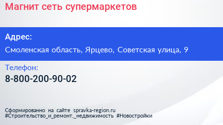 Магнит, сеть супермаркетов по адресу Смоленская область, Ярцево, Советская улица, 9 в дальнейшем Организация, размещена в следующих категориях: