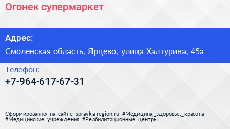 Огонек, супермаркет по адресу Смоленская область, Ярцево, улица Халтурина, 45а в дальнейшем Организация, размещена в следующих категориях: