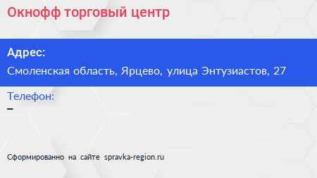 Окнофф, торговый центр по адресу Смоленская область, Ярцево, улица Энтузиастов, 27 в дальнейшем Организация, размещена в следующих категориях: