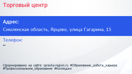 Торговый центр по адресу Смоленская область, Ярцево, улица Гагарина, 15 в дальнейшем Организация, размещена в следующих категориях: